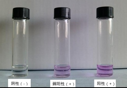 2min 內(nèi)觀察顏色變化,若溶液出現(xiàn)粉紅至紫紅色,則判為陽(yáng)性(+);無(wú)色判為陰性(-)。