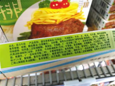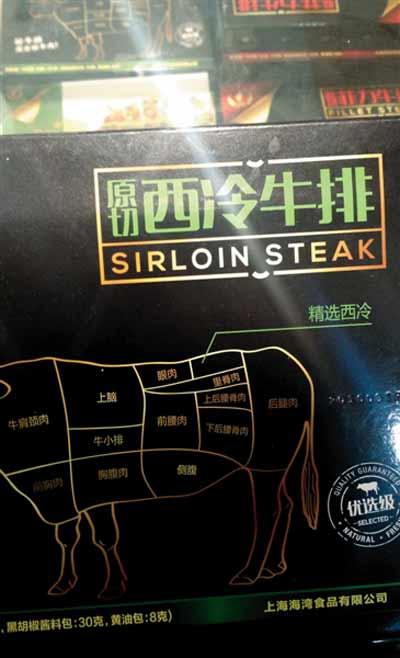 上海海灣食品有限公司生產的一款188g裝牛排產品,在配料表中注明添加了卡拉膠、谷氨酰胺轉氨酶等食品添加劑,但在產品包裝上卻冠以醒目的“原切菲力牛排”。另一款標稱為“原切西冷牛排”的產品,配料表顯示也添加了卡拉膠、黃原膠、三聚磷酸鈉等食品添加劑。兩款產品執(zhí)行標準均為《SB/T10379-2012速凍調制食品》。