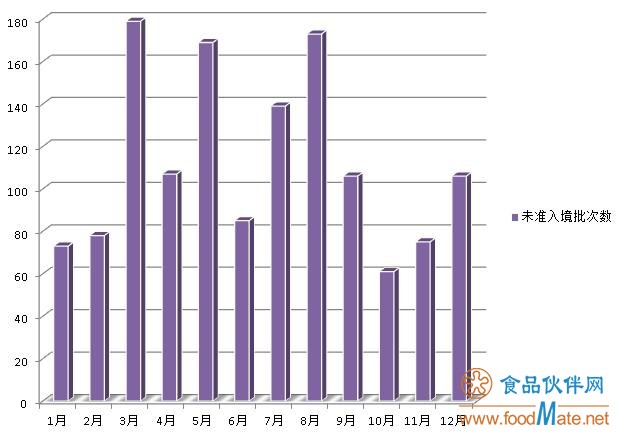 2018年共有1351批次超三千多噸食品檢出不符合我國法律法規和標準而未準入境。每月未準入境的食品批次數量如圖所示,其中,3月、5月、8月檢出的不合格批次數量居多。