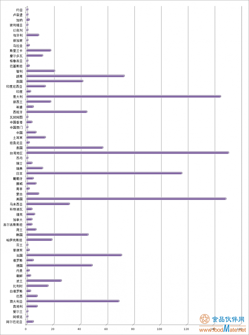 統計顯示,這些食品來自六十多個國家或地區。其中,意大利、美國、日本這些國家以及臺灣地區的不合格食品居多,尤以臺灣地區的最多。